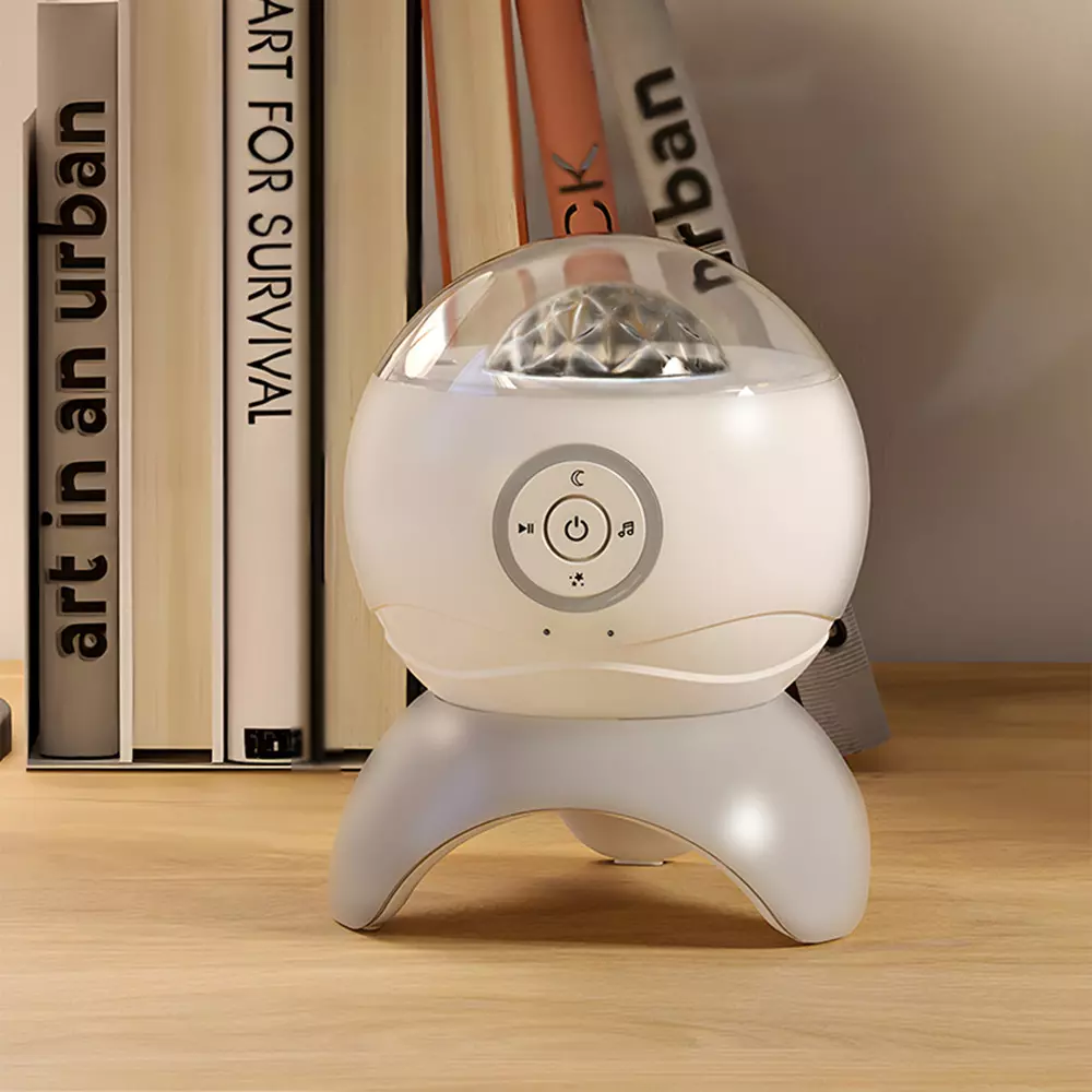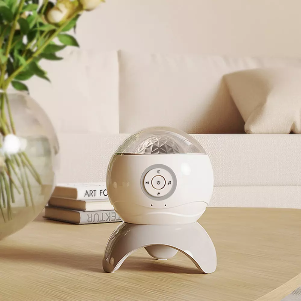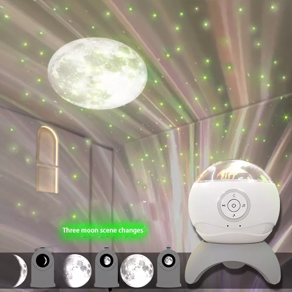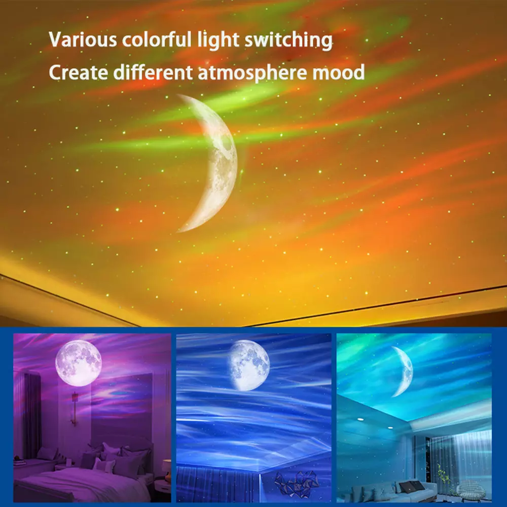 Northern lights, nebula, spiral cloud, crescent moon, half moon, full moon, starry sky top, many combinations of light projection, built-in 10 white noise, play bluetooth music, can be adjusted remotely to the color of the light, etc., voice control, morning and evening greetings