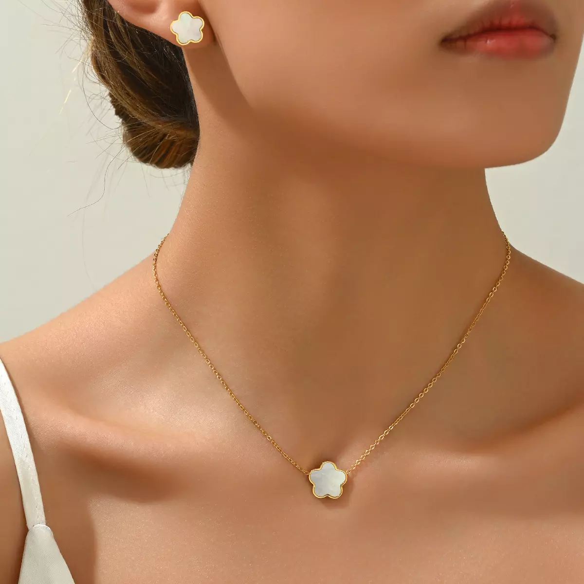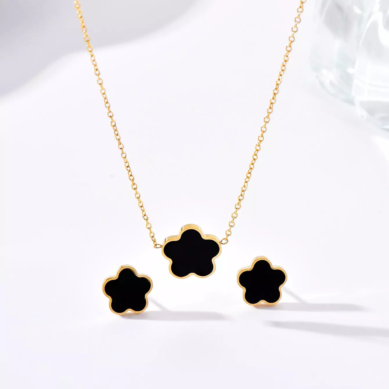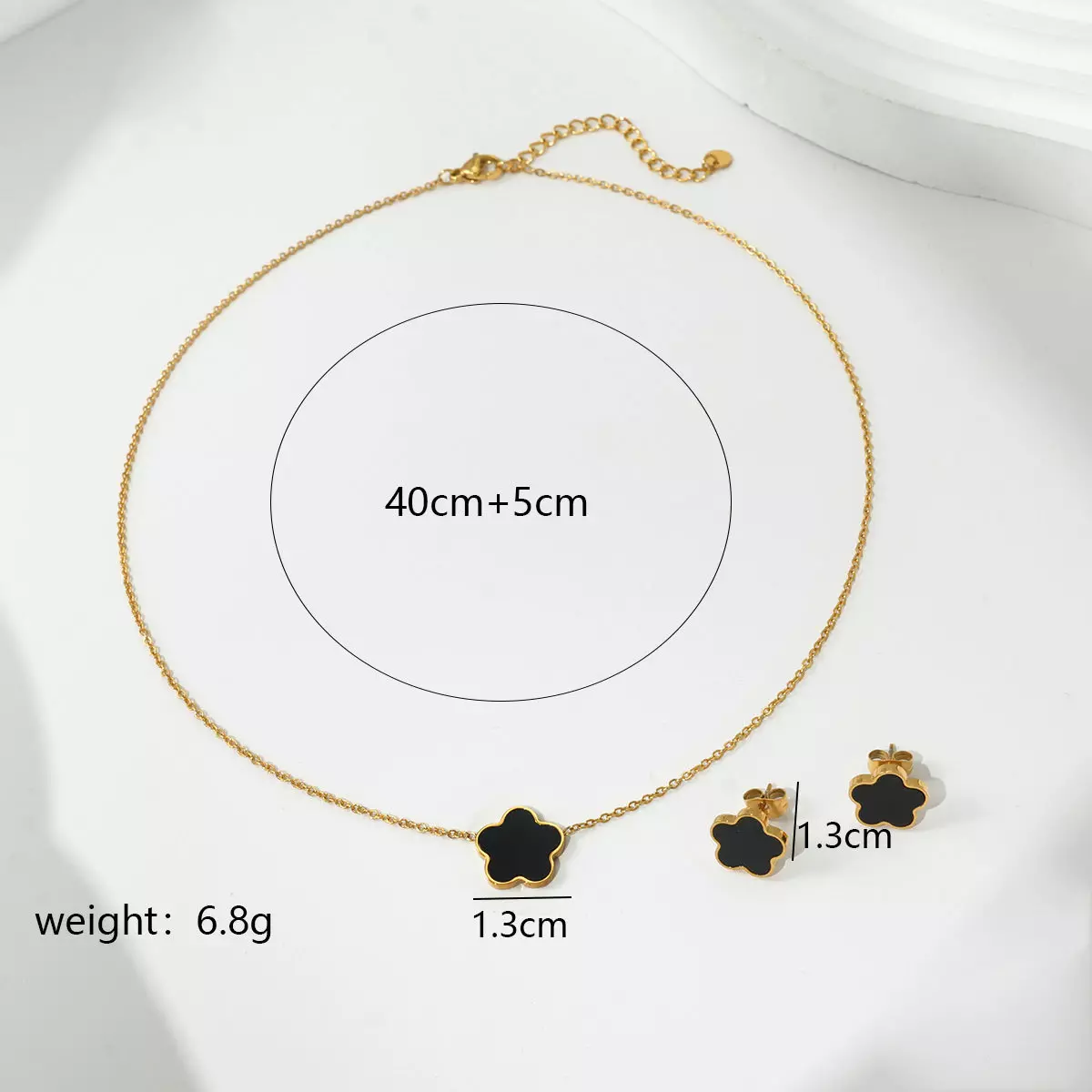Five-leaf flower set black and white shell titanium steel necklace and earrings