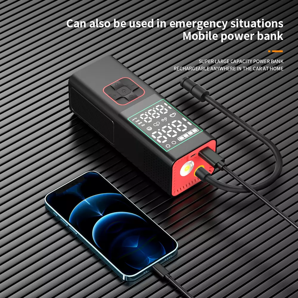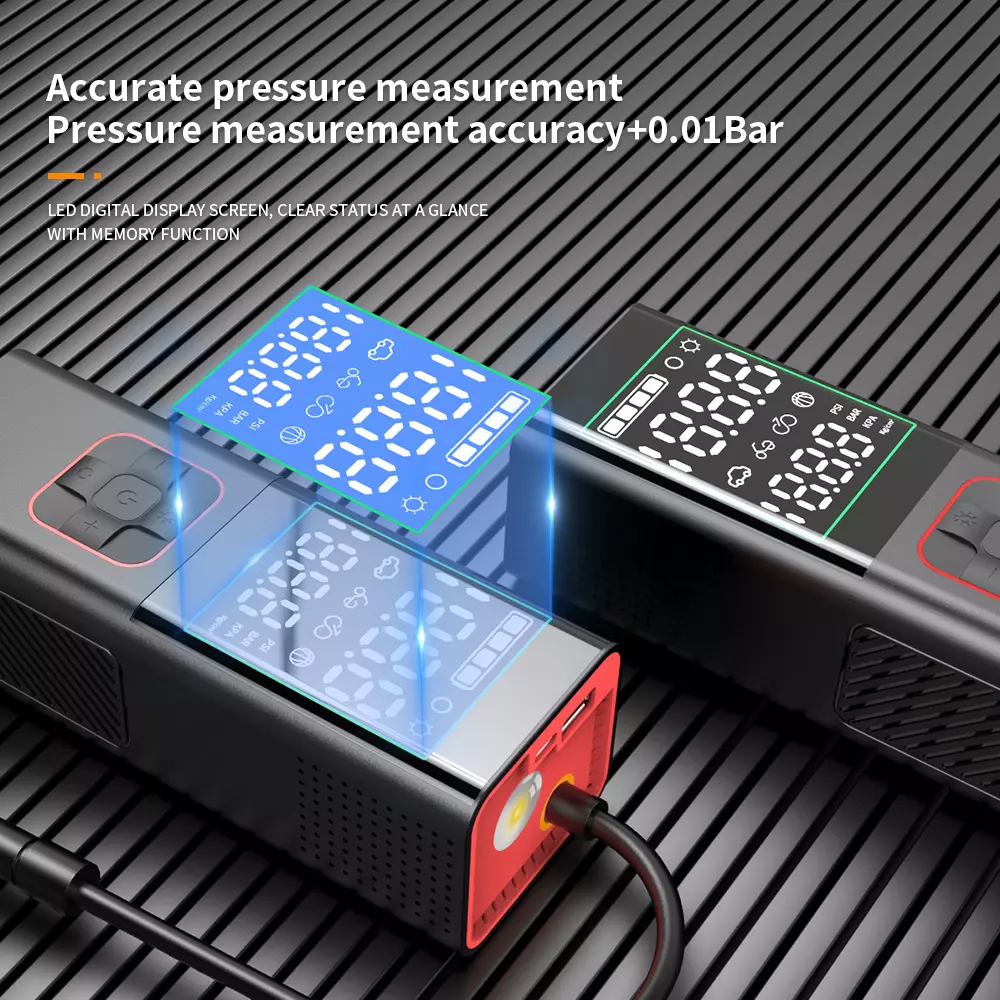 3. Interactive interface for: ball, bicycle, car gear, customized gear (0-160PSI). 4. Users can adjust to the corresponding gear to inflate the inflatable objects, when the air pressure reaches the preset value of the system air pressure, the air pump will automatically stop inflating, for the unfamiliar with the setting of the value of the air pressure of the user group to provide safe and reliable use of the security.