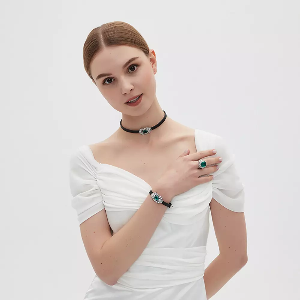 S925 sterling silver imitation emerald cowhide collar, vintage light luxury as the core of the design, fusion of sterling silver exquisite luster and cowhide high-grade texture, with imitation emerald main stone, to create a celebrity atmosphere sense of accessory.