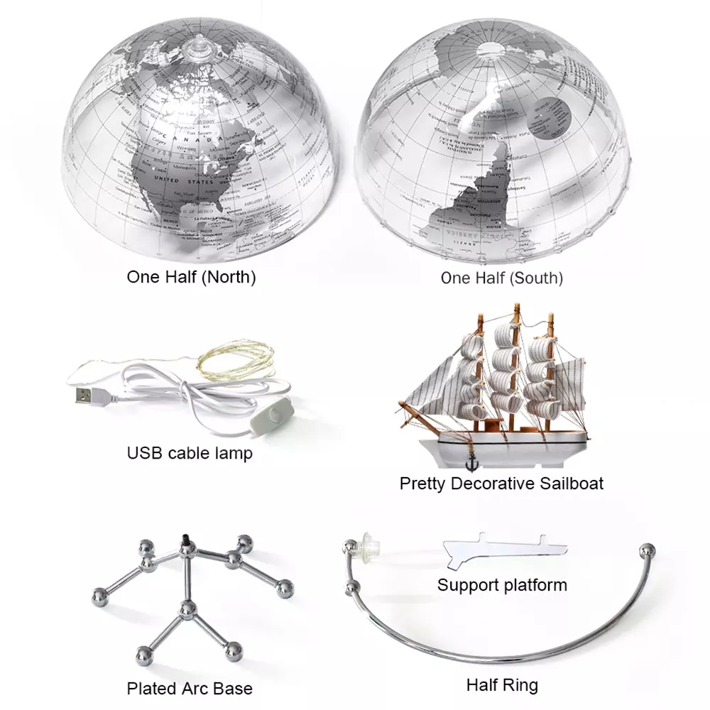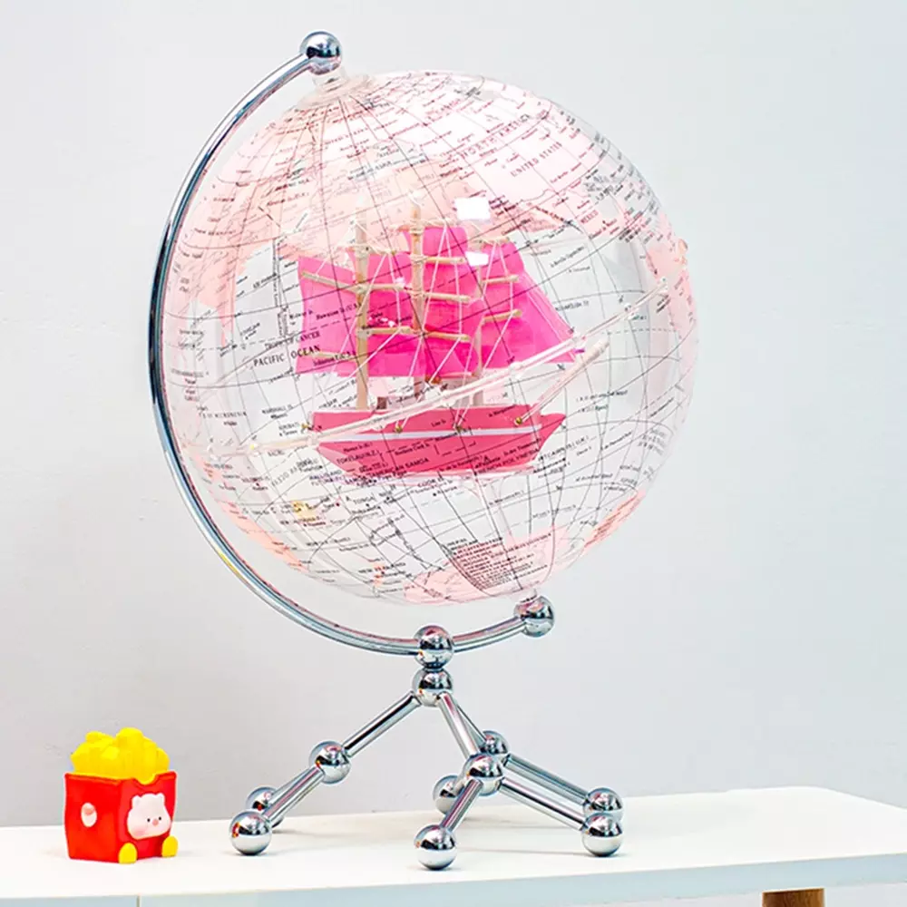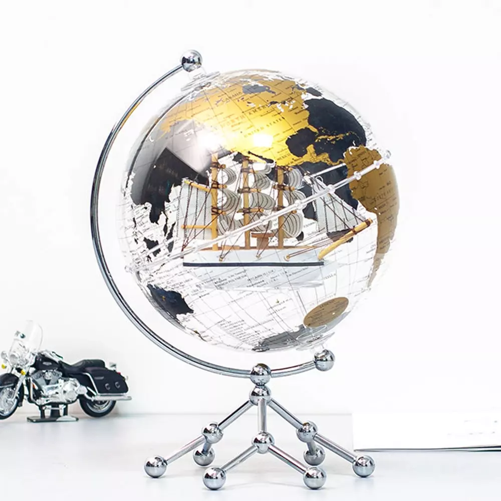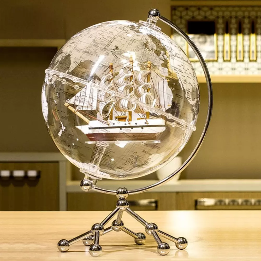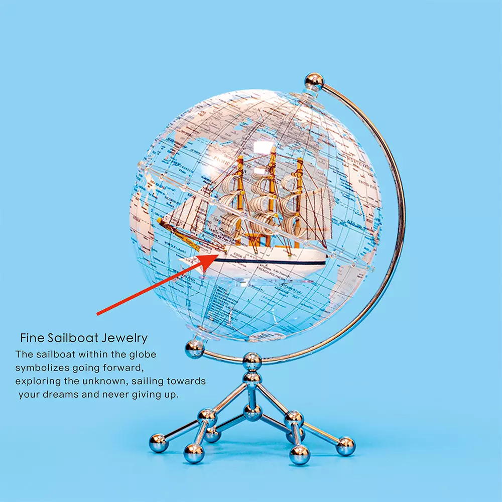 This clear acrylic globe is unique in that it has an ornate sailboat ornament built into the center of the sphere, as if it were sailing freely on the vast ocean. The transparent acrylic sphere reveals a detailed earth pattern that clearly depicts the boundaries of land and sea, presenting a colorful map of the world. In the center of the sphere, an exquisite sailboat is presented in lifelike detail, with white sails fluttering as if ready to break the wind and waves and move forward. This unique design not only adds a fun and decorative touch to the globe but also signifies a call to the spirit of exploration and adventure, inspiring a sense of aspiration and a passion for inquiry. Whether it is placed in a study, office, or living room, it can be an eye-catching focal point, adding a unique charm and inspiration to the space.
