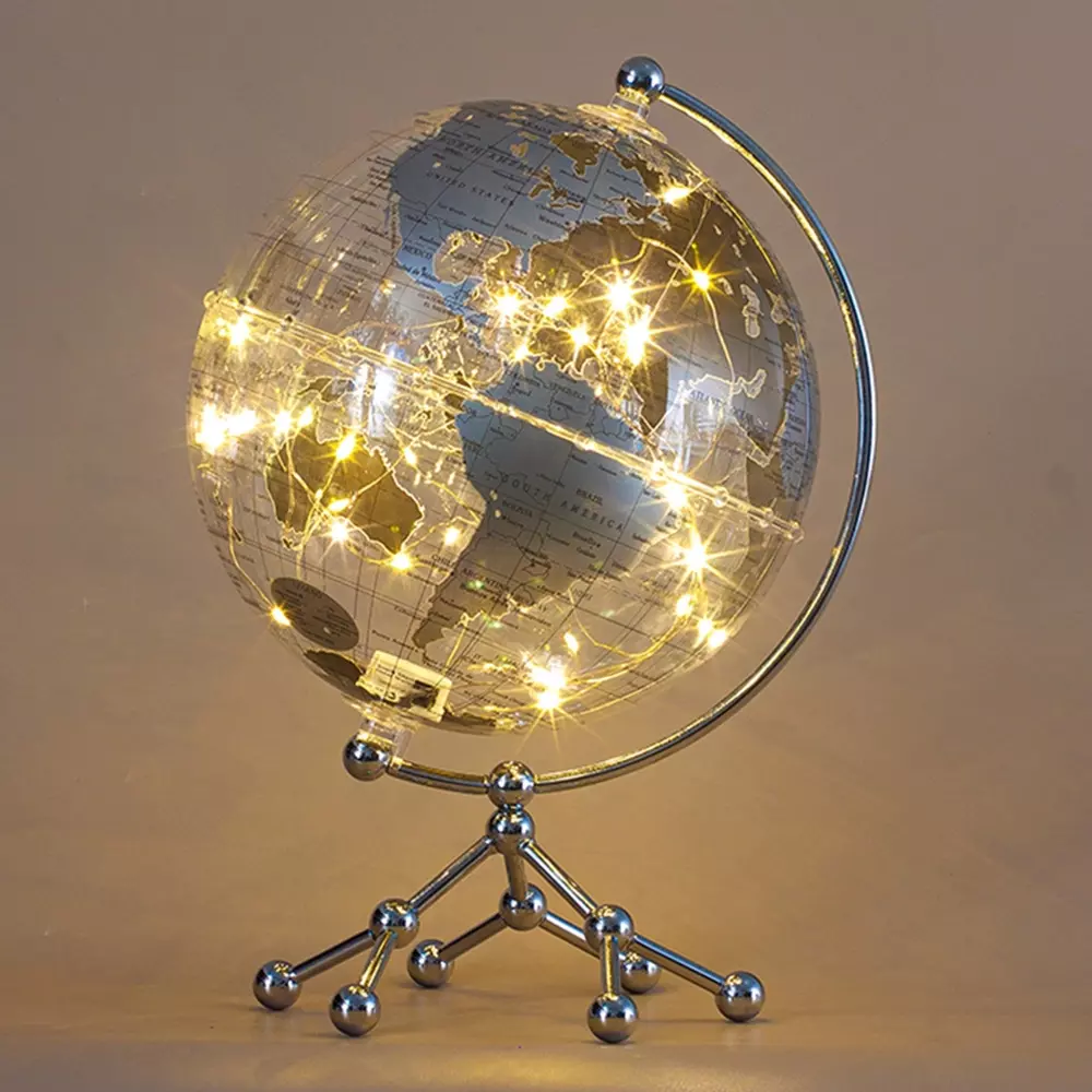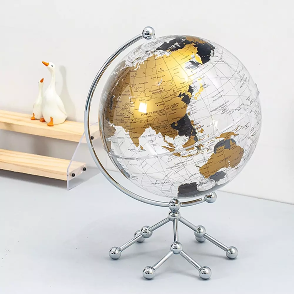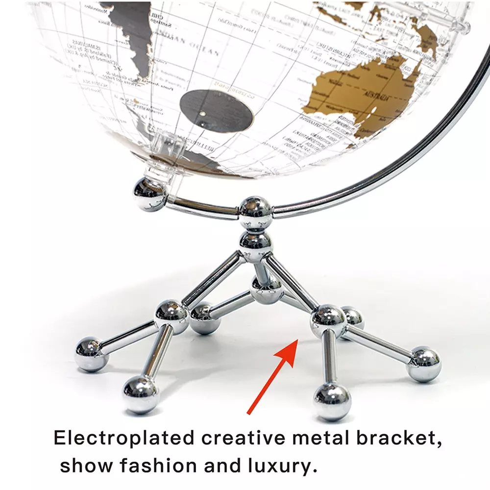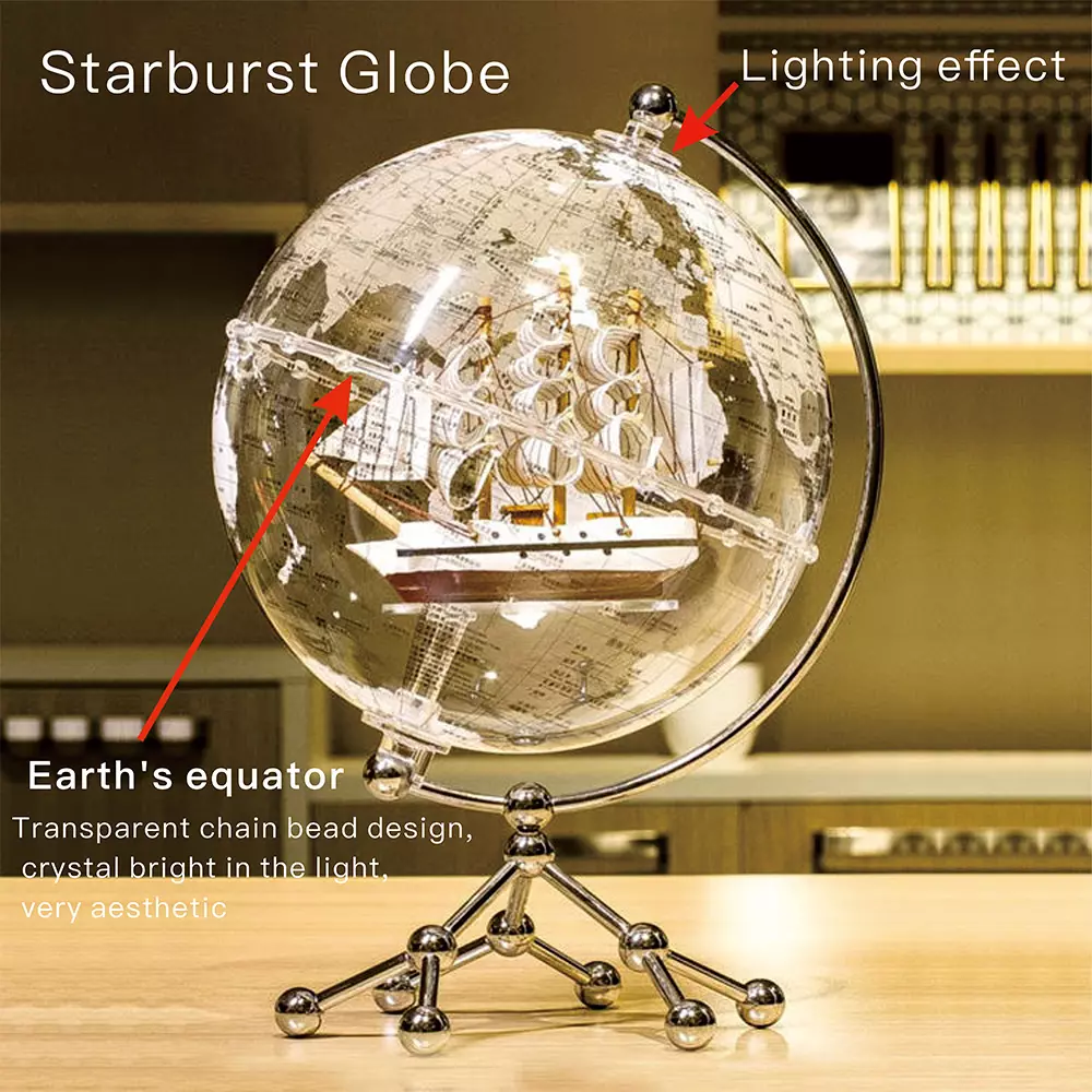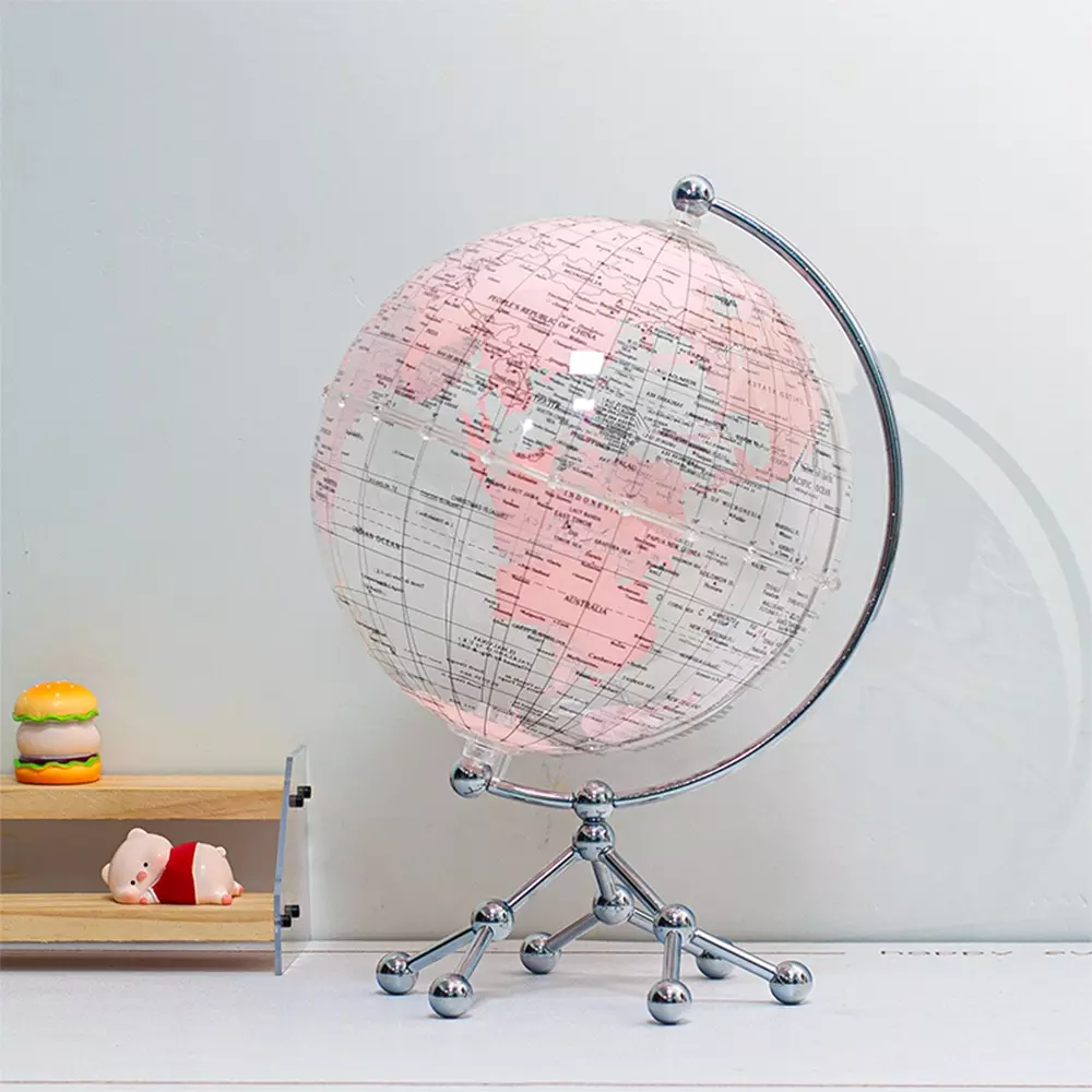 This clear acrylic globe is unique in that it has an ornate sailboat ornament built into the center of the sphere, as if it were sailing freely on the vast ocean. The transparent acrylic sphere reveals a detailed earth pattern that clearly depicts the boundaries of land and sea, presenting a colorful map of the world. In the center of the sphere, an exquisite sailboat is presented in lifelike detail, with white sails fluttering as if ready to break the wind and waves and move forward. This unique design not only adds a fun and decorative touch to the globe but also signifies a call to the spirit of exploration and adventure, inspiring a sense of aspiration and a passion for inquiry. Whether it is placed in a study, office, or living room, it can be an eye-catching focal point, adding a unique charm and inspiration to the space.